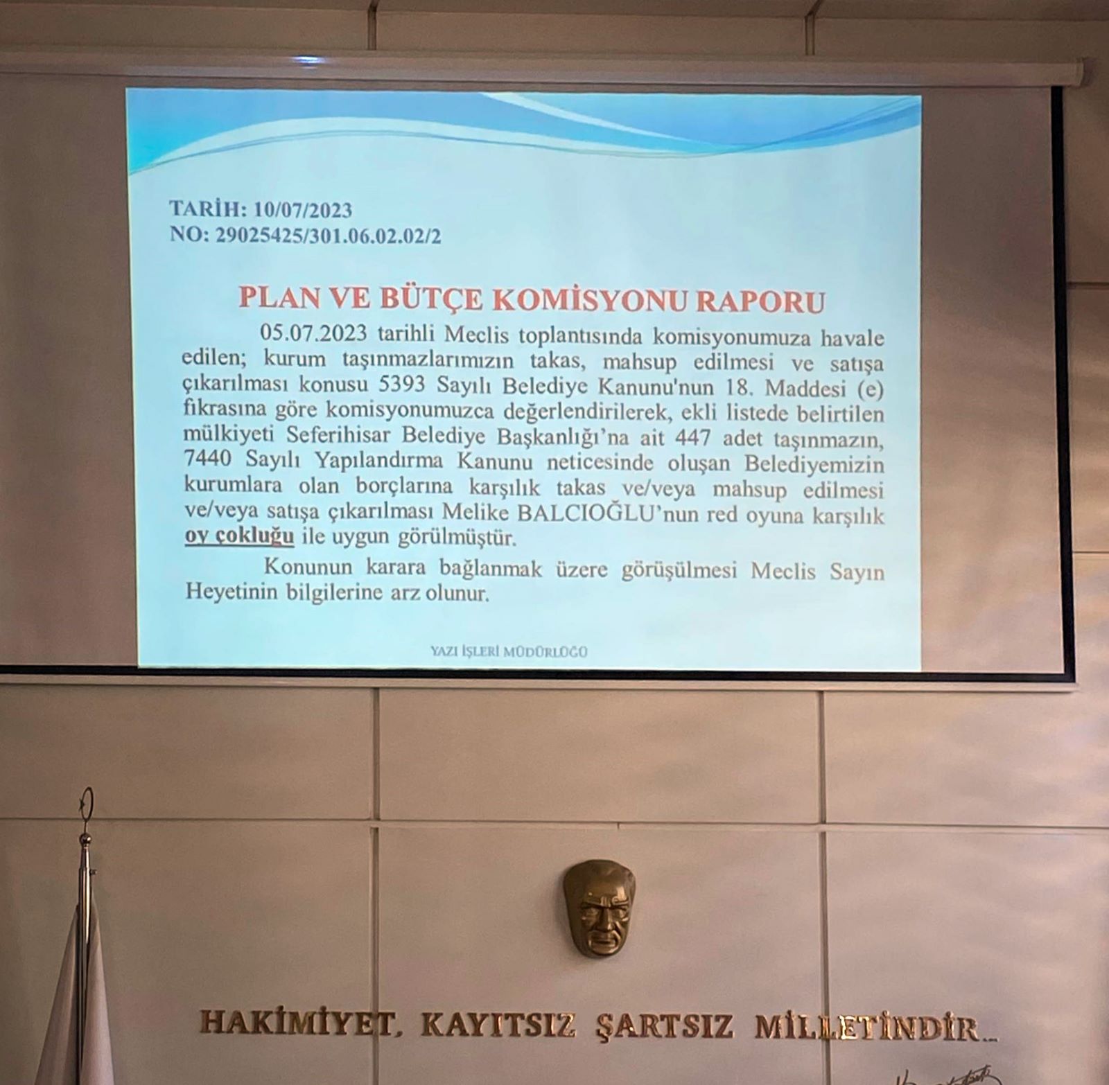 Seferihisar Belediyesi’nin Temmuz ayı meclis toplantısında ek gündem maddesiyle meclise getirilen Seferihisar Belediye Başkanlığı’na ait 447 adet taşınmazın takas, mahsup edilmesi veya satışa çıkarılması konusu Plan ve Bütçe Komisyonu’na havale edilmişti.