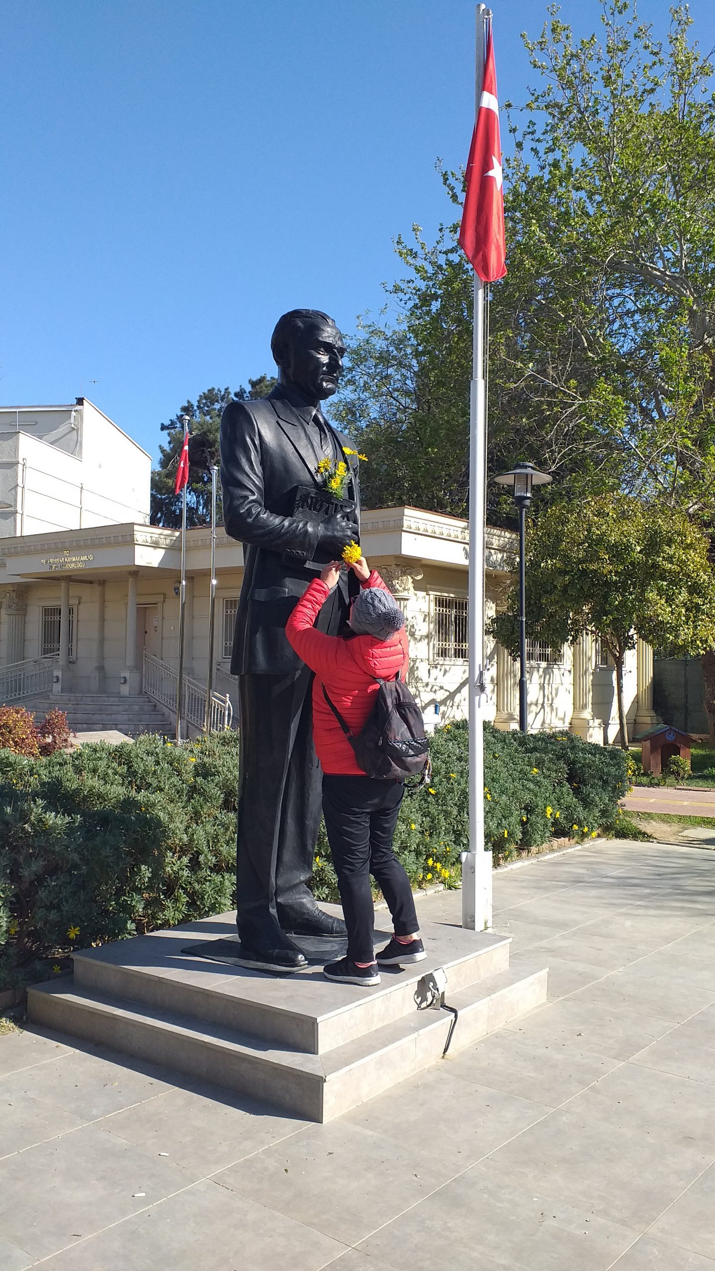 Tüm Seferihisar adına Ulu Önder Mustafa Kemal Atatürk’e şükranlarını sunan Sevil Ege’nin yayınını gören vatandaşlarda Ata’ya saygı için çiçek bıraktı.
