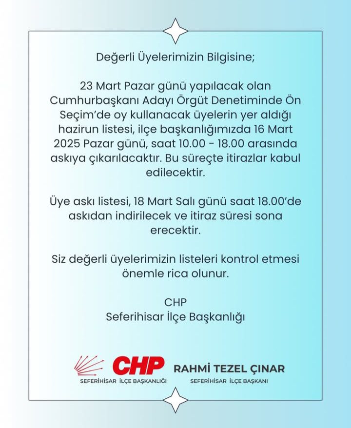 CHP Seferihisar İlçe Başkanlığı, 23 Mart Pazar günü gerçekleşecek Cumhurbaşkanı Adayı Örgüt Denetiminde Ön Seçim için hazırlanan hazirun listesinin 16 Mart 2025 Pazar günü saat 10.00-18.00 arasında askıya çıkarılacağını duyurdu.