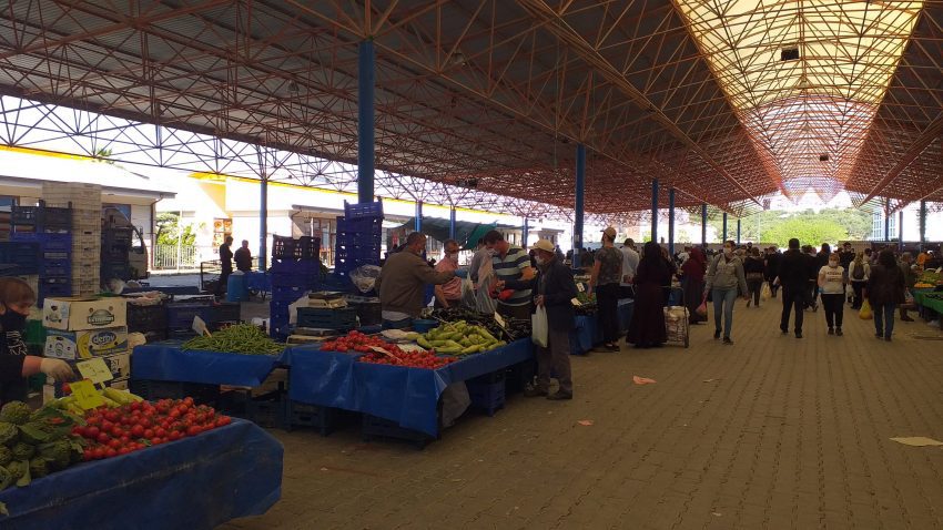 Pazaryeri alışverişi oldukça yoğun yapılırken girişte Seferihisar Belediyesi zabıtaları ve Polisler kurallara uyulması için vatandaşları uyardı.