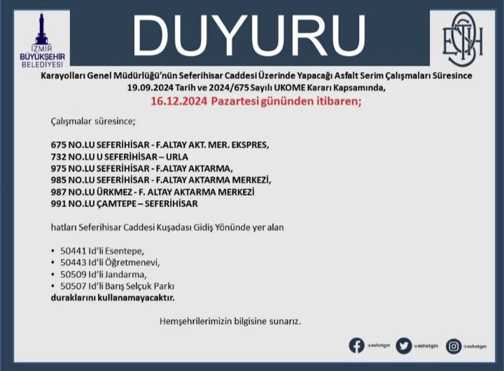 Karayolları Genel Müdürlüğü, Seferihisar Caddesi üzerinde yapacağı asfalt serim çalışmaları kapsamında, 16 Aralık 2024...