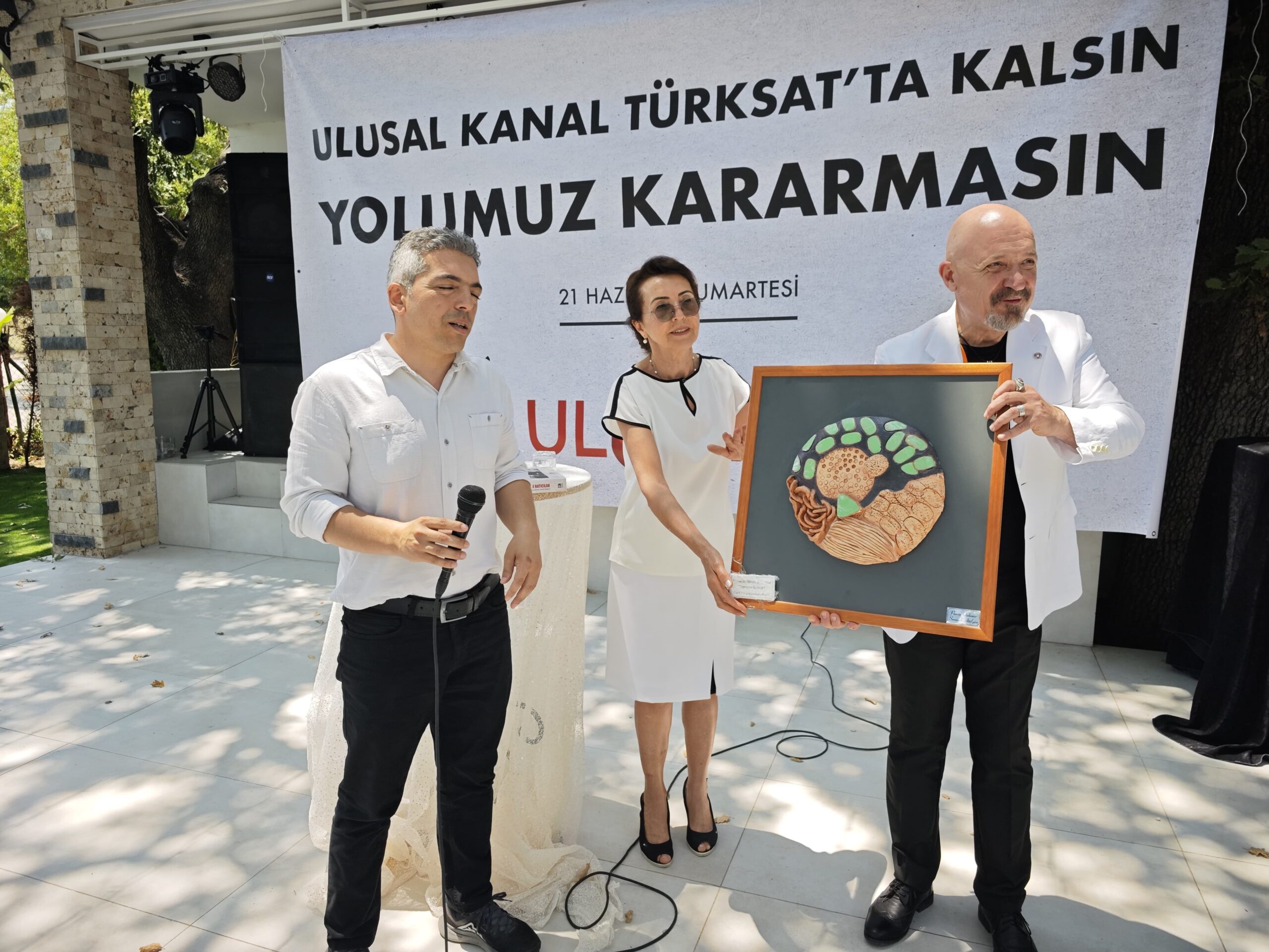 “Ekranımızı keseriz diye bize gönderilen kağıdı hep birlikte yırtıp atalım. Ulusal Kanal çalışanları sizden müjde bekliyor. Çünkü biz bir imece televizyonuyuz. Bugün 30 civarında televizyon var, çoğu sistem televizyonu. Sahipleri iş insanı, çıkar grubu ya da medya mafyası. Ama Ulusal Kanal halkın kanalı. Meryem Teyzelerle kurduk, yine onlarla ayakta duracağız. Bugün İzmir’den Ulusal Kanal ailesine güzel bir haber vermenizi istiyoruz.”