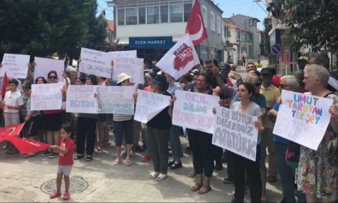 Bademler Köyü halkı İzmir Milli Eğitim Müdürlüğü ve İl Müftülüğü arasında gerçekleştirilen okullara imam görevlendirilmesi projesini köy meydanında toplanarak protesto etti.