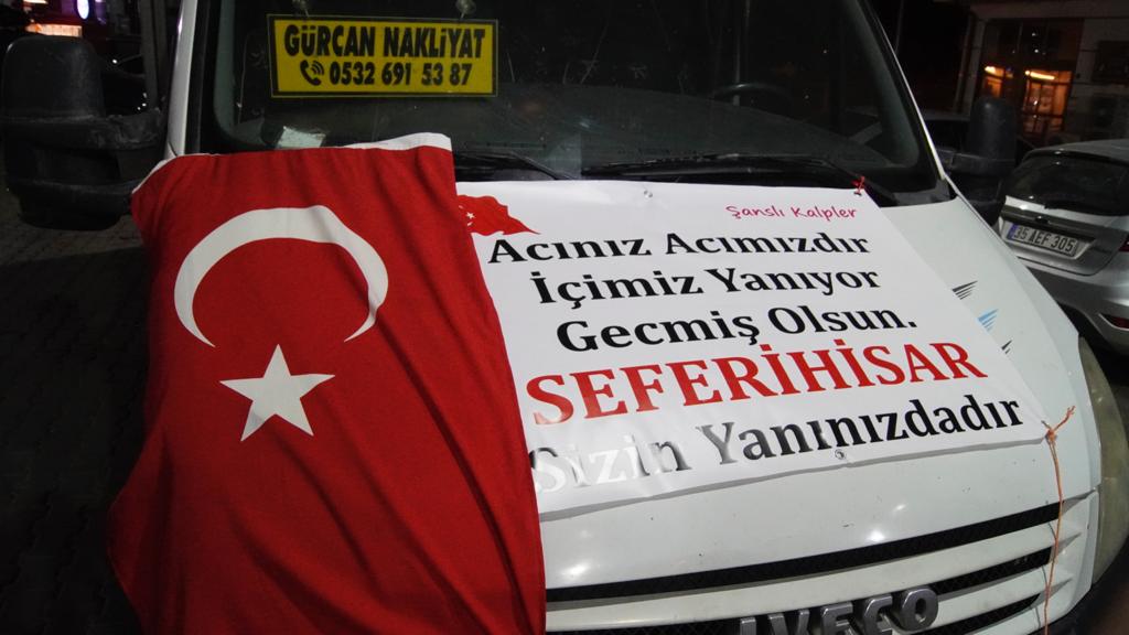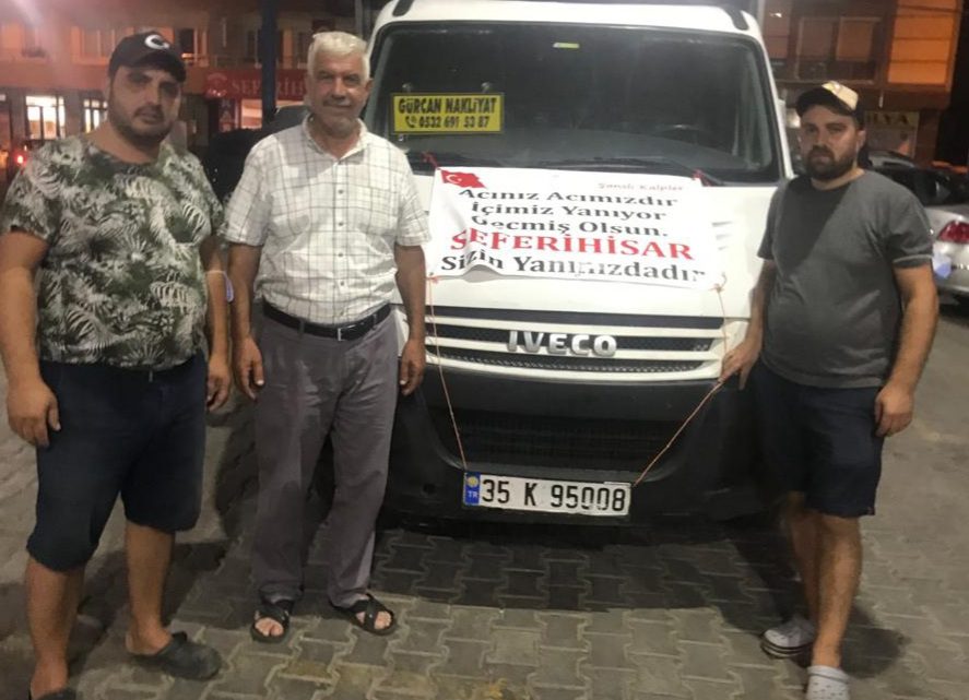 Seferihisar esnafından, müteahitine, ev hanımından işçisine herkes elinden gelen desteği sundu ve bir kamyon dolusu malzeme yola çıktı. 4 bin adet şu, 400 adet yangın şapkası, 400 adet fenerli kask şapka, kedi köpek mamaları, çocuk mama ve bezleri, 4 koli yangın merhemi ve çok sayıda battaniye gibi bir çok ihtiyacın yüklü olduğu kamyonun sahibi Gürcan Arsu’ da ücretsiz olarak taşımayı üstlendi.