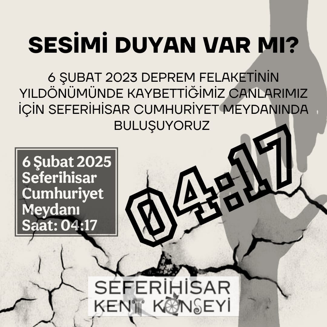 Seferihisar Kent Konseyi, 6 Şubat 2023’te meydana gelen depremin yıl dönümünde, depremde hayatını kaybeden vatandaşları anmak için anlamlı bir etkinlik düzenleyecek. “Sesimi Duyan Var mı?” sloganıyla gerçekleştirilecek anma programı, 6 Şubat Perşembe sabahı saat 04.17’de Seferihisar Cumhuriyet Meydanı’nda yapılacak.