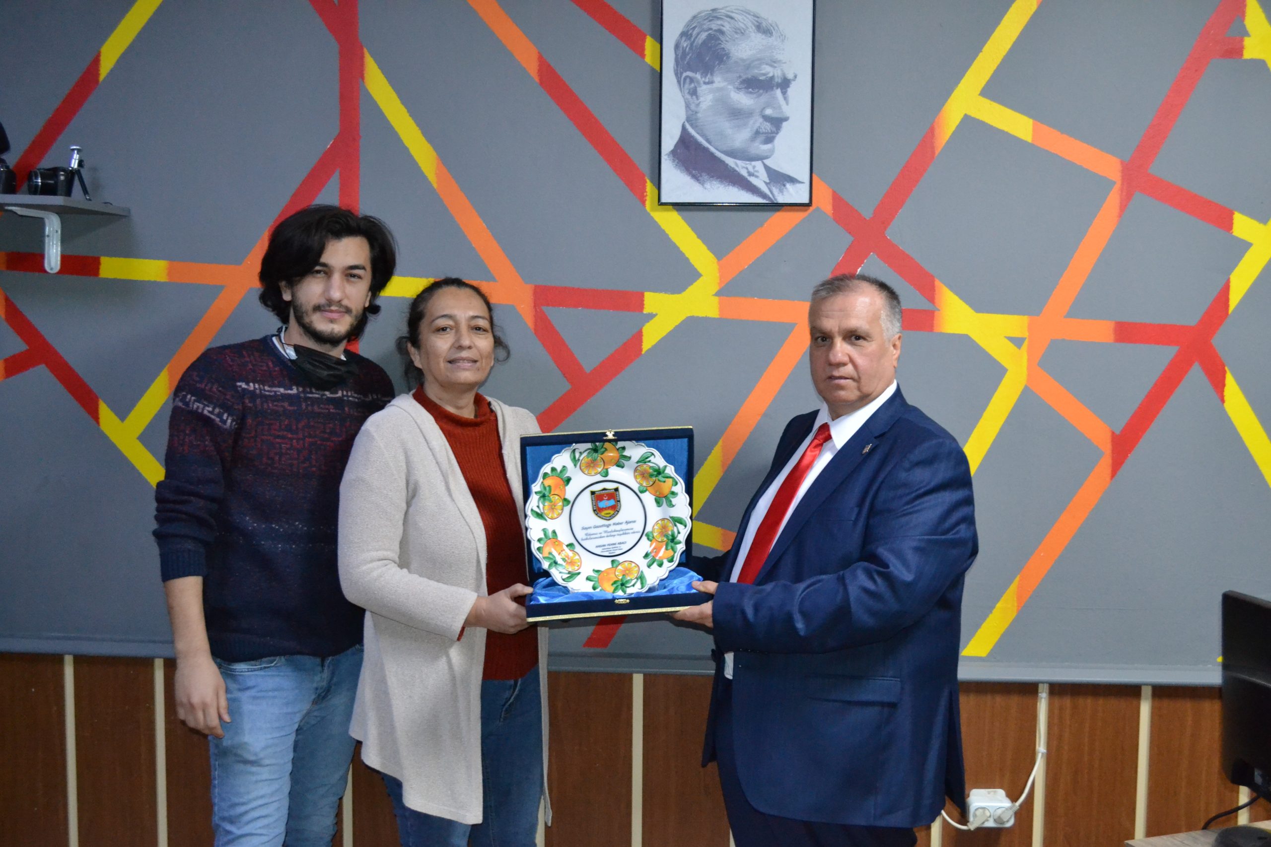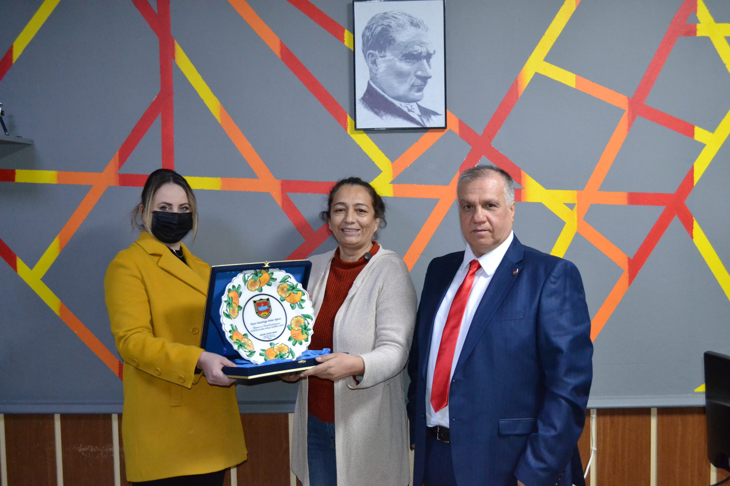 Seferihisar Şoförler ve Otomobilciler Odası Başkanı Hasan Fehmi Abacı ve Genel Sekreteri Perihan Gülcü teşekkür için GazetEge imtiyaz sahibi Cemrecan Tutar ile Haber Koordinatörü Sevil Ege’ye Seferihisar mandalinası ile süslü özel tasarım seramik işçilik tabak plaket taktim etti.