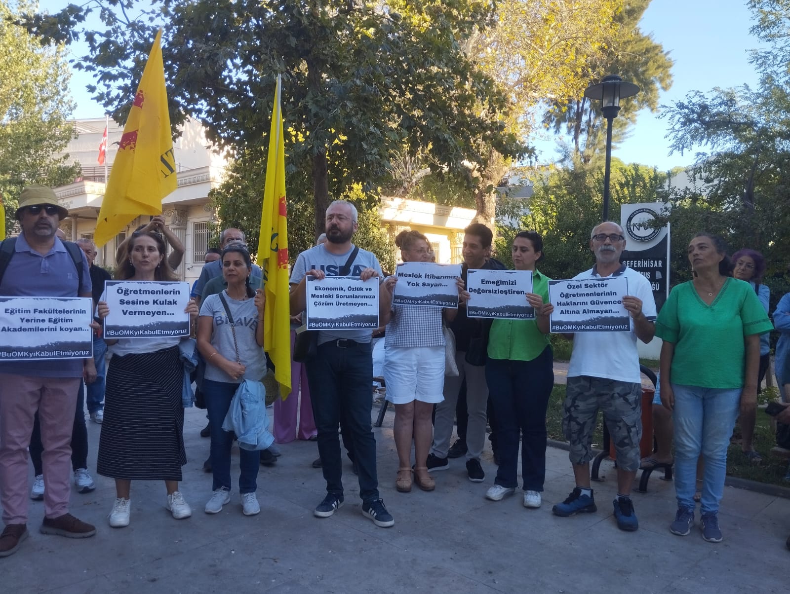 Eğitim-Sen Seferihisar temsilcisi Necip Vardal ve Eğitim-İş Seferihisar temsilcisi Diler Atmaz, öğretmenlerin taleplerine yanıt vermeyen mevcut Öğretmenlik Mesleği Kanunu’nun (ÖMK) kabul edilemez olduğunu vurguladılar.