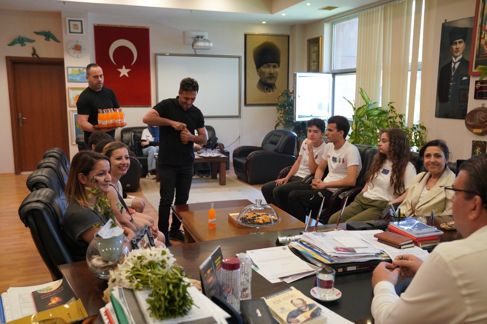 İtalya’daki programı başarı ile tamamlayan öğretmen ve öğrenci grubu Seferihisar Belediye Başkanı İsmail Yetişkin’i, destekleri için teşekkür etmek ve bilgilendirme yapmak için ziyaret ettiler. Başkan Yetişkin, ziyaretine gelen öğretmen ve öğrencilere, belediyenin yeni üretimine başladığı mandalina gazozu ikram etti.