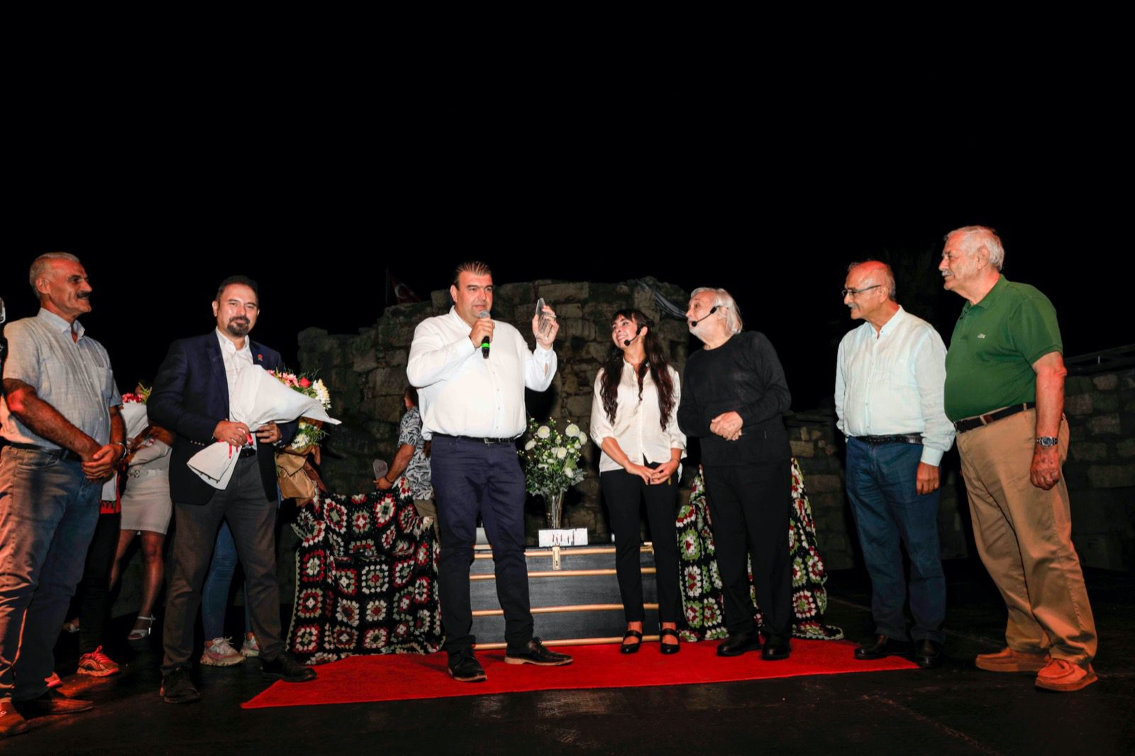 Seferihisar Belediye Başkanı İsmail Yetişkin oyunun ardından Kaleiçini dolduran tüm sanatseverler adına Gezen ailesine çiçekle teşekkür etti.