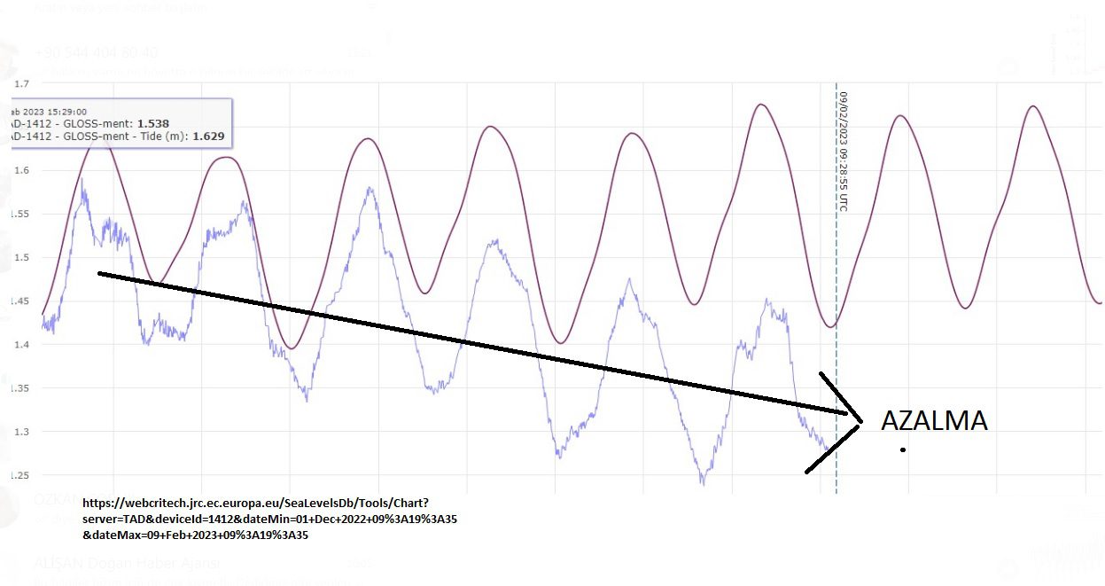 Deniz çekilmesi ile ilgili detaylı güncel grafikleri de paylaşan Ulutaş “Burada gözlemlenen deniz çekilmesi ise deprem ile ilgili değildir. Çünkü çekilme belirli aralıklarla yavaş yavaş gelişmiş ve devamlılık göstermektedir. Bir süre sonrada asıl haline gelecektir. BU durumu irdelemek için Aralık ayının başından beri bölgedeki gelgit seviyesi incelendi (en yakın Menteş istasyonu kullanıldı) ve son günlerde normal seviyenin altın düzenli azalan bir düşüş görüldü. Aşağıdaki şekilde Mavi ile azalan kısım kırmızı ile gösterilen olağan gelgit seviyelerinin altındadır. Gelgitler yerküremizin uydusu ayın çekim etkisinden dolayı olağan deniz seviyesi değişimlerinin. Bu olağanlığın altı veya üstü çoğunlukla “storm surge” dediğimiz kuvetli rüzgar oluşumunun öncesinde veya sonrasında gözlemlenebilir. Bölgede birkaç gün önce gemileri dahi alabora eden fırtınanın etkisi bunun sebeplerinden olabilir. Olası bir deprem ile ilgili değildir. ” dedi.