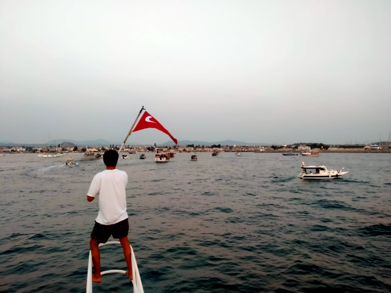 Sahilde bulunan tur tekneleri ve balıkçı tekneleri vatandaşlar ile birlikte denize açıldı. Türk bayrakları ve marşlar eşliğinde Teos Marina karşısında turlayan tekneler Sahil Güvenlik komutanlığı ekipleri ve Deniz polisi kontrolünde yol aldı.