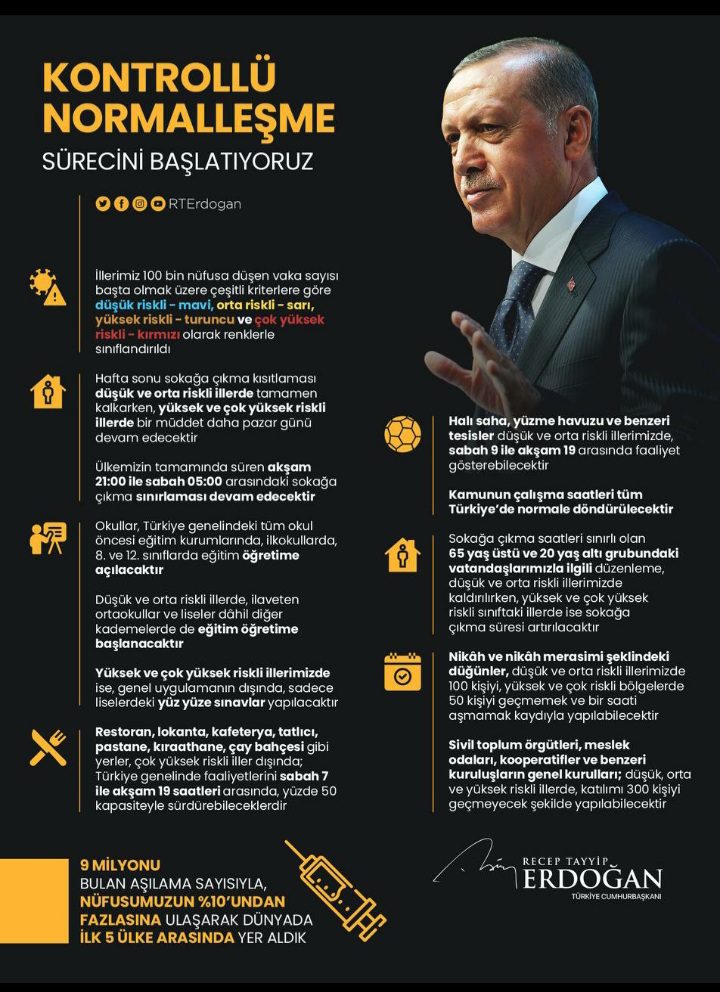 Hafta sonu sokağa çıkma kısıtlaması yüksek ve çok yüksek riskli illerde bir müddet daha pazar günü devam edecek.Düşük ve orta riskli illerde ilaveten ortaokullar ve liseler dahil diğer kademelerde eğitim-öğretime başlanacaktır. Ülkemizin tamamında süren akşam 21.00 ile sabah 05.00 arasındaki sokağa çıkma sınırlaması sürecek. Kamunun çalışma saatleri tüm Türkiye’de normale döndürülecek, ihtiyaç halinde valilikler farklı düzenlemeler yapabilecektir. Yüksek ve çok yüksek riskli illerimizde genel uygulamanın dışında sadece liselerdeki yüz yüze sınavlar yapılacaktır
